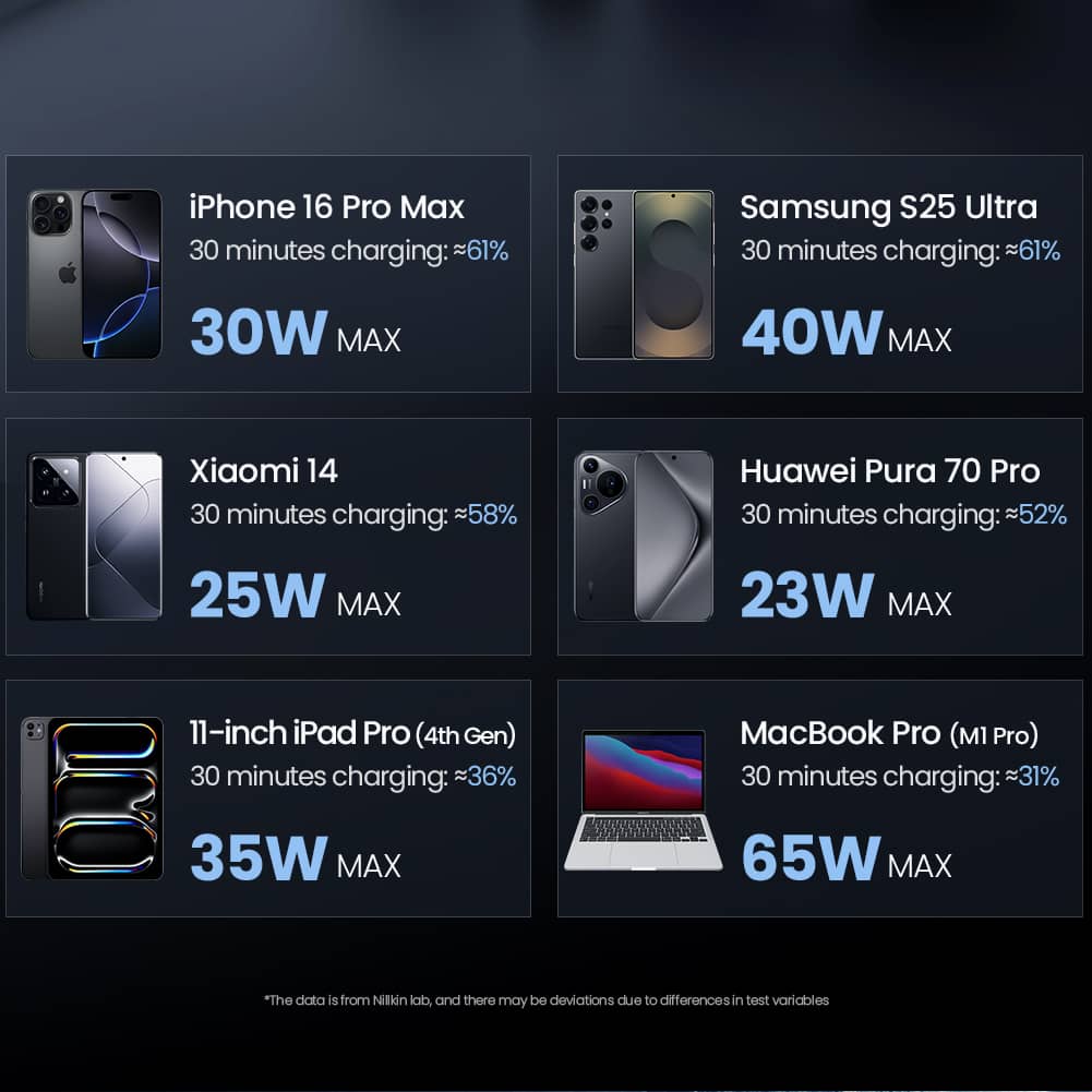 Delivers 65W fast charging for 30+ minutes while keeping temperatures low to protect battery health.