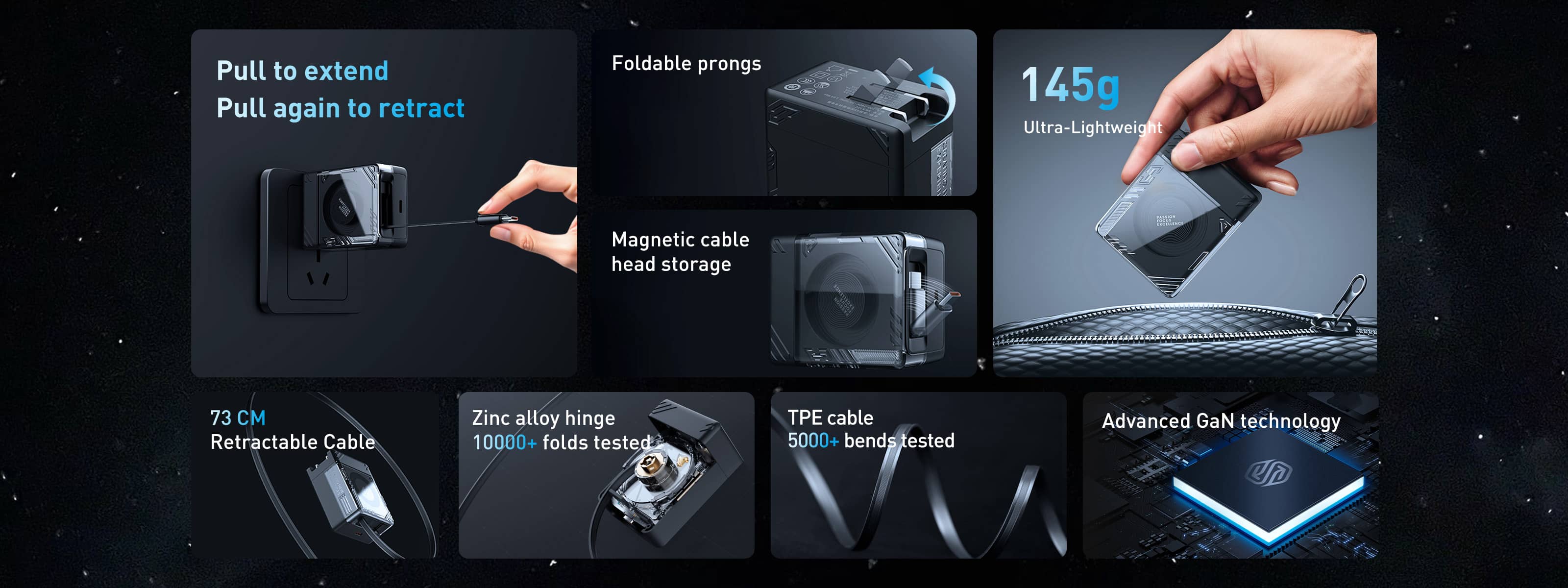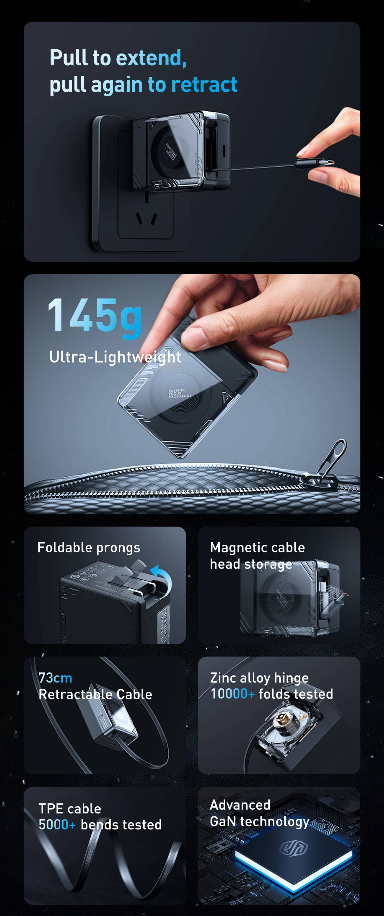 • Retractable USB-C Cable: 5V⎓3A / 9V⎓3A / 12V⎓3A / 15V⎓3A / 20V⎓3.25A (65W Max)