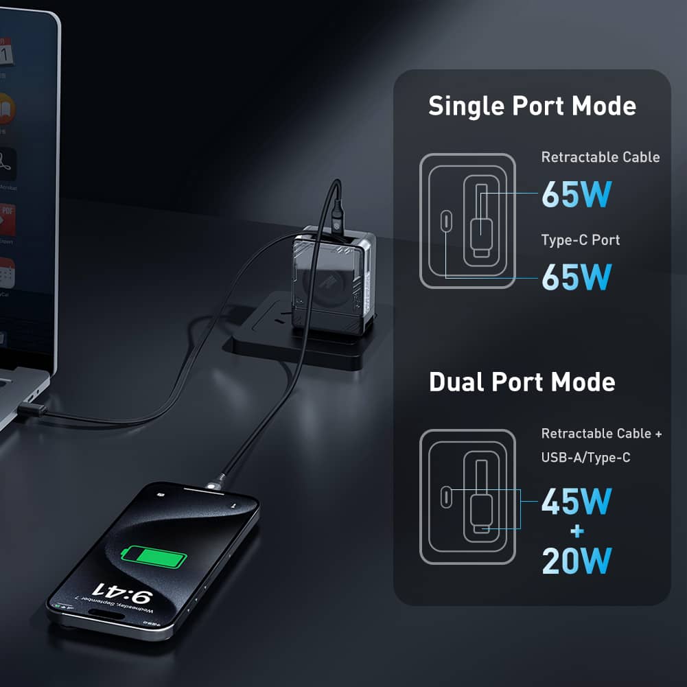 • Dual-port use: 45W (Retractable Cable) + 20W (USB-C Port)