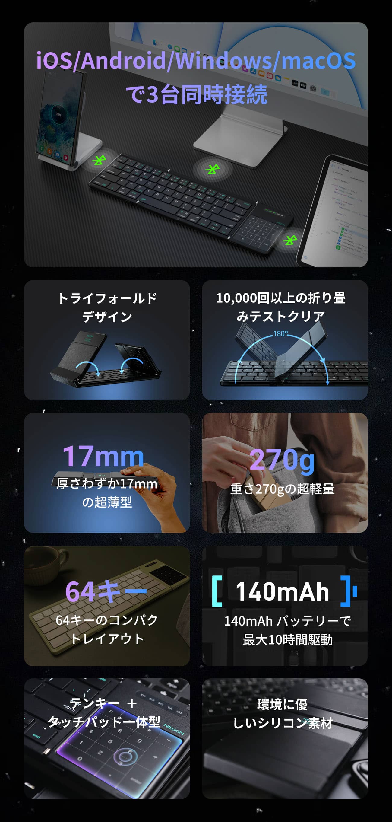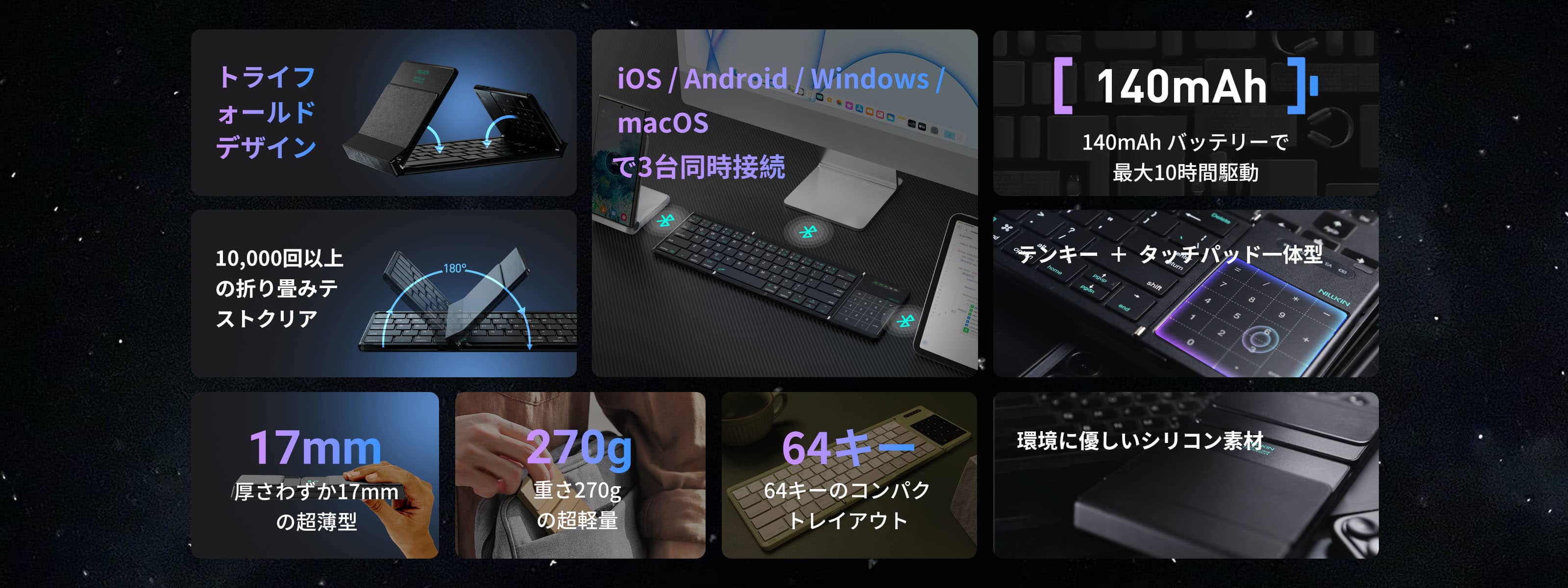 フルサイズのキーボードに展開し、ポケットサイズの忍者のように折りたためます(わずか270gで、月曜日のやることリストよりも軽いです)。