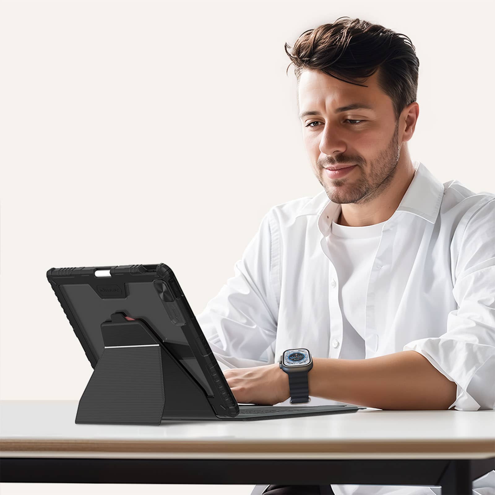 This keyboard case provides the ultimate combination of functionality and protection. Its durable keyboard base, precisely formed hardbound case, and sliding camera cover offer unparalleled safeguarding and privacy for your iPad during use.