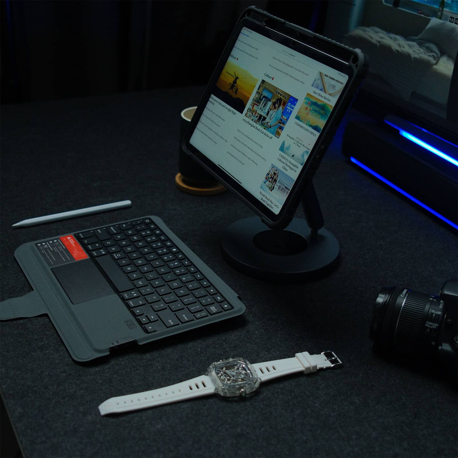 The case features a rechargeable backlit keyboard with 7 colors and 4 brightness levels, allowing you to easily use your iPad even in a dark environment. The key is quiet and comfortable for typing, and the built-in highly sensitive trackpad enables smooth scrolling, swiping, and more. With the Anti-Mistouch Technology trackpad, bid farewell to cursor distractions while typing.