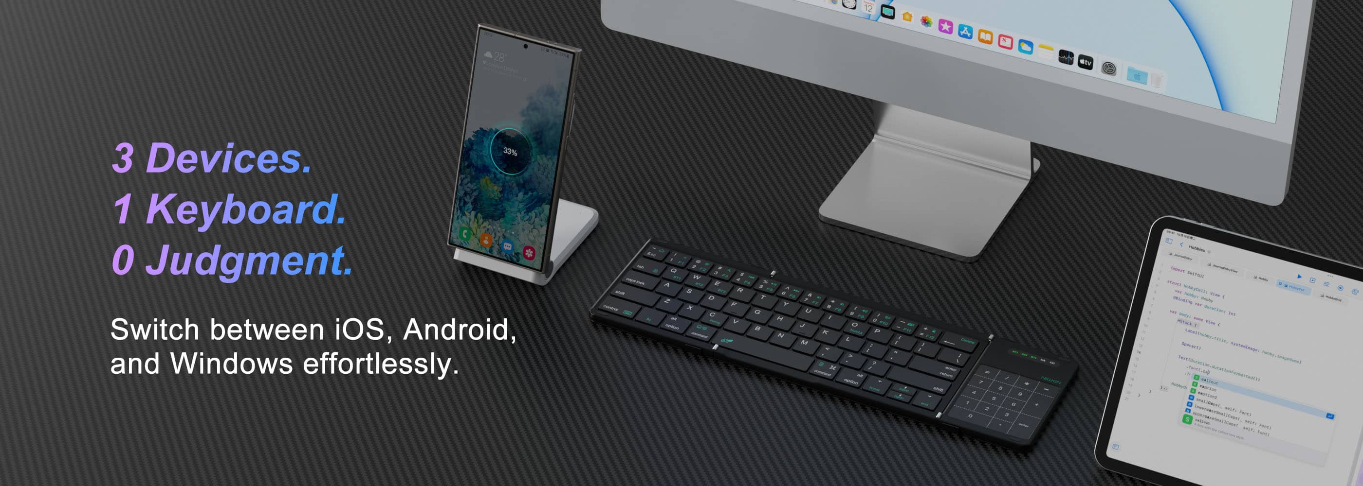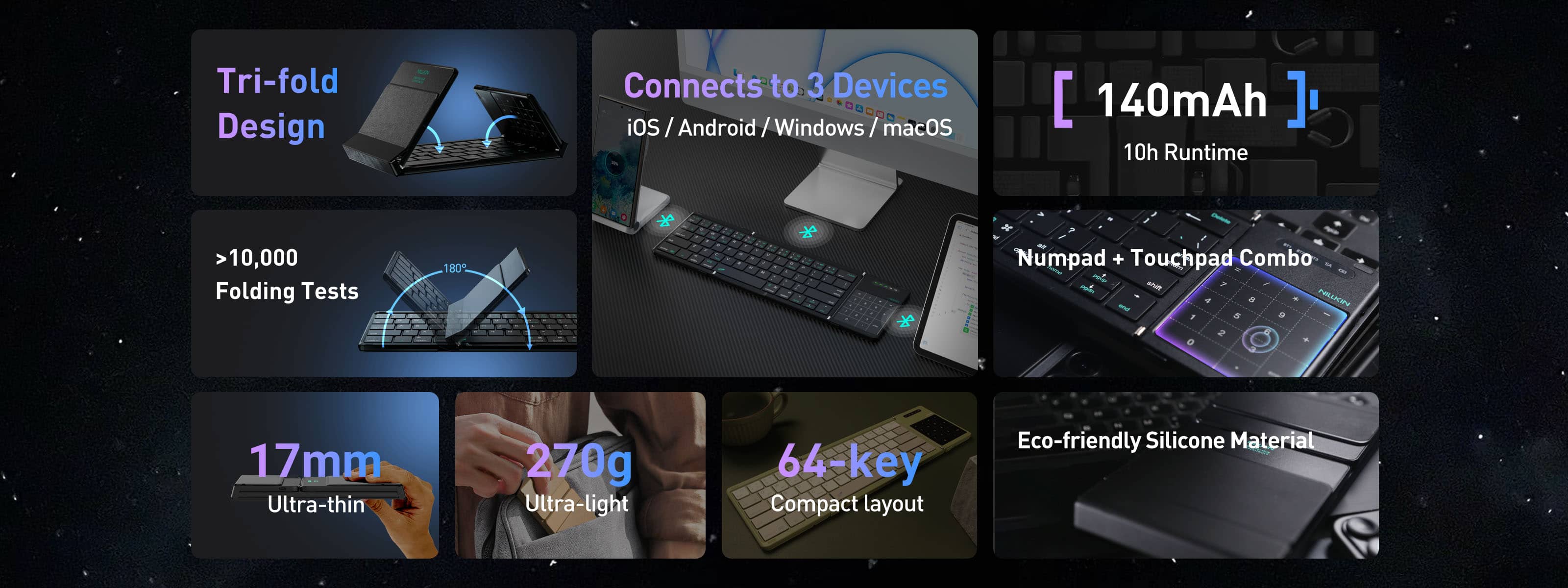 Unfolds into a full-sized keyboard, folds into a pocket-sized ninja (only 238g—lighter than your Monday to-do list).