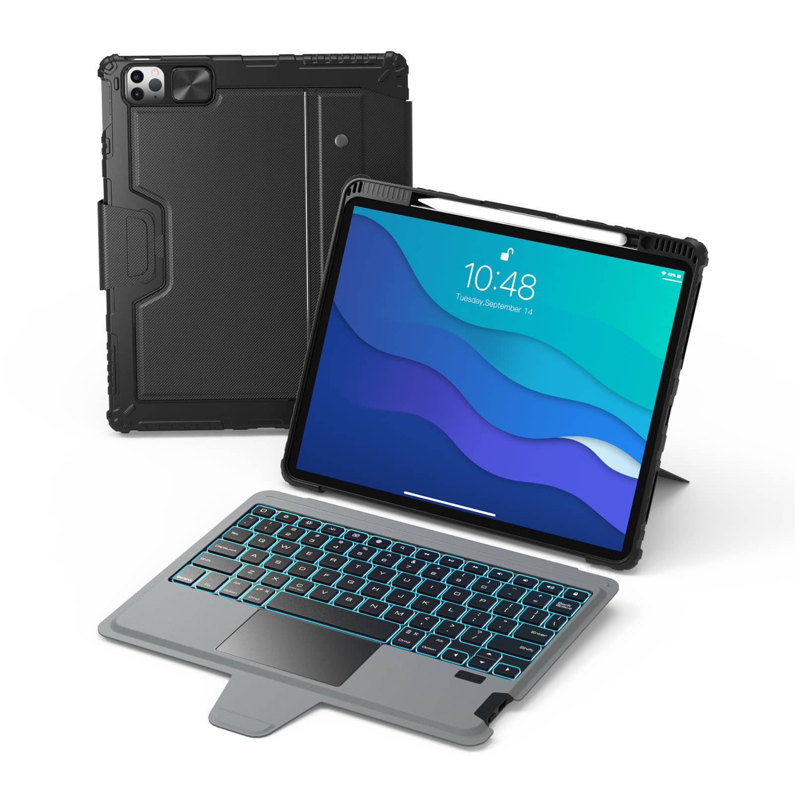 The case features a rechargeable backlit keyboard with 7 colors and 4 brightness levels, allowing you to easily use your iPad even in a dark environment. The keyboard is quiet and comfortable for typing, and the built-in highly sensitive trackpad enables smooth scrolling, swiping, and more. With the Anti-Mistouch Technology trackpad, bid farewell to cursor distractions while typing.