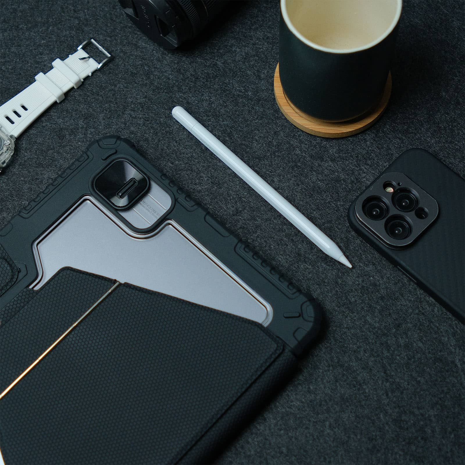 This keyboard case provides the ultimate combination of functionality and protection. Its durable keyboard base, precisely formed hardbound case, and sliding camera cover offer unparalleled safeguarding and privacy for your iPad during use.