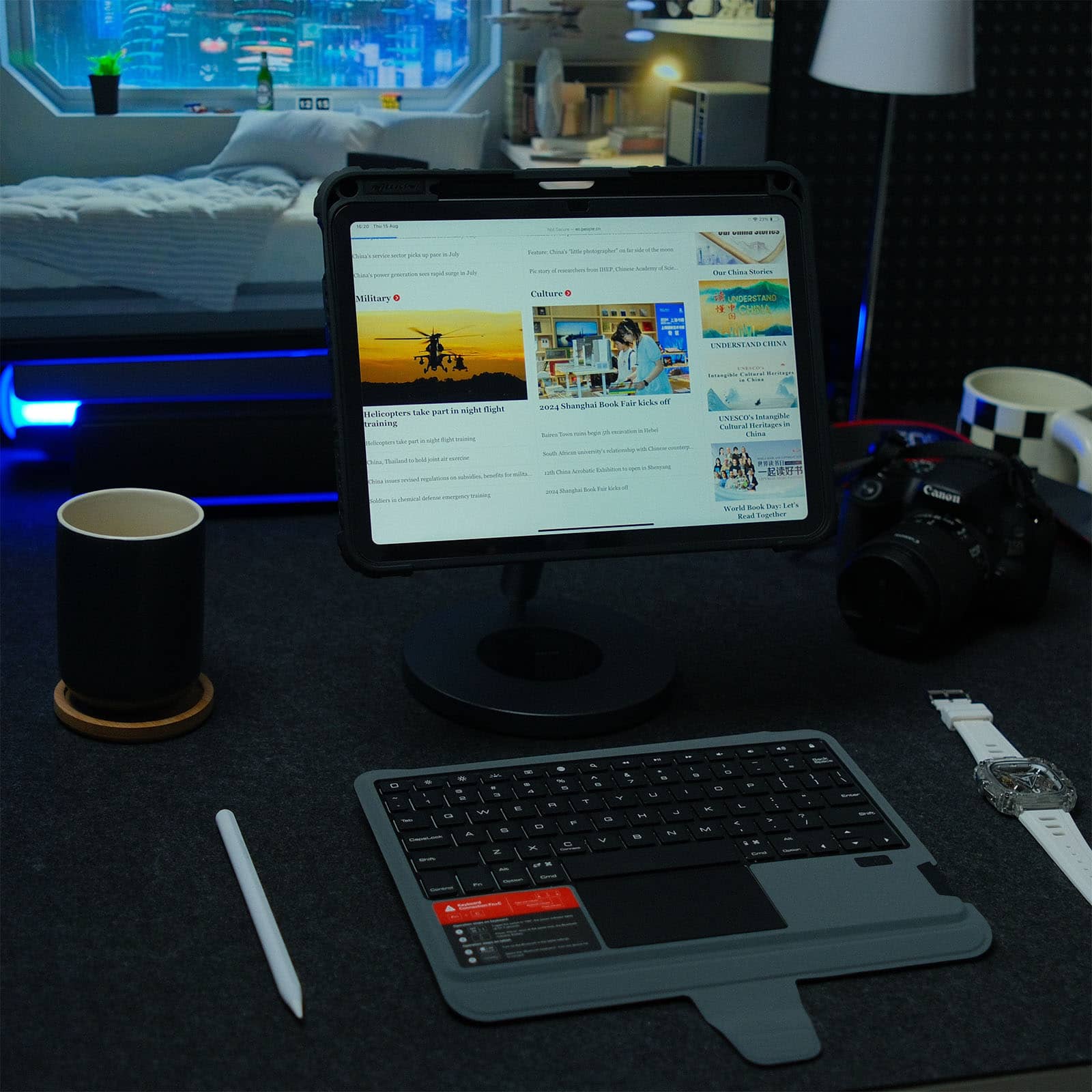 The case features a rechargeable backlit keyboard with 7 colors and 4 brightness levels, allowing you to easily use your iPad even in a dark environment. The key is quiet and comfortable for typing, and the built-in highly sensitive trackpad enables smooth scrolling, swiping, and more. With the Anti-Mistouch Technology trackpad, bid farewell to cursor distractions while typing.
